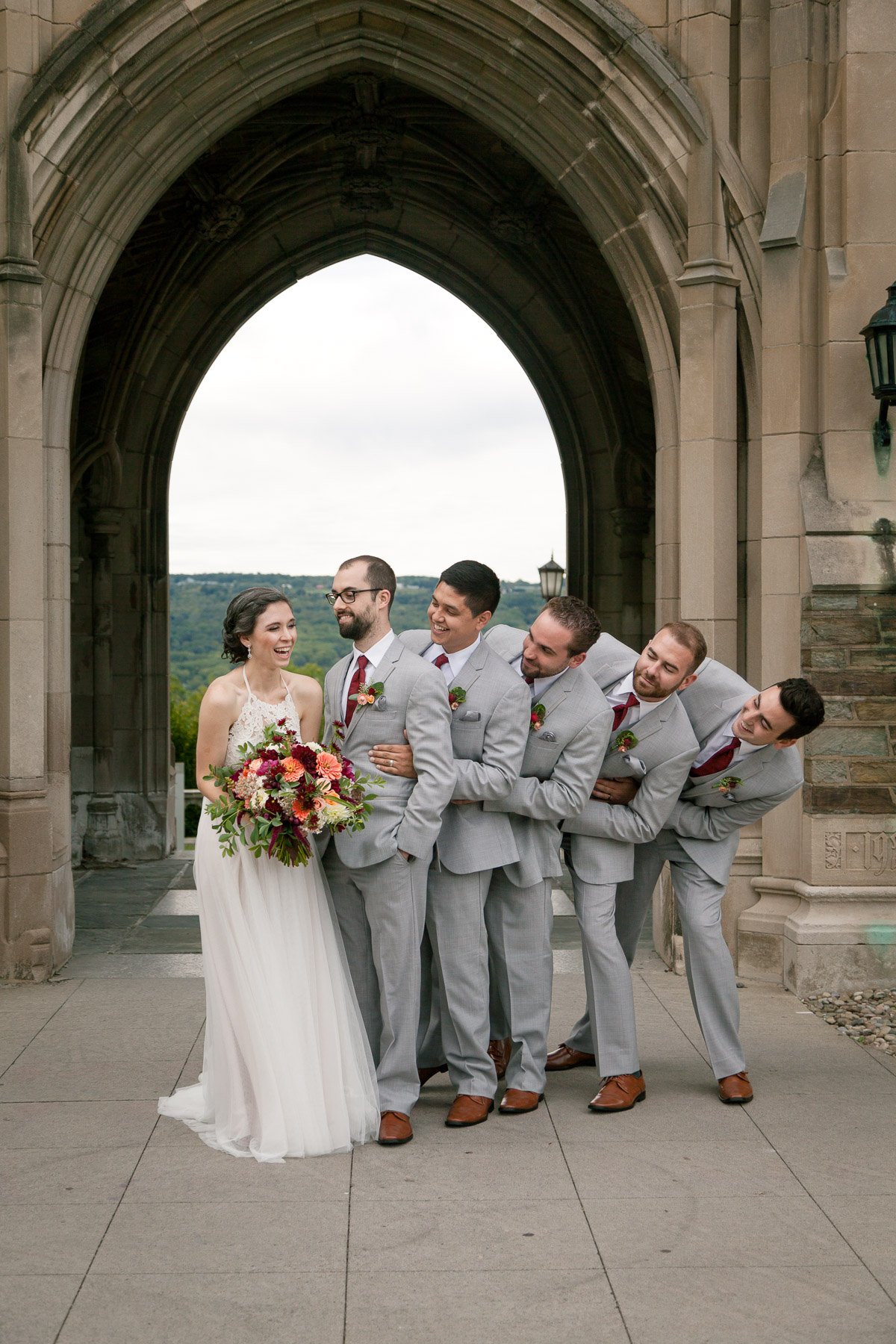 We did a “first look” with Addison, and then the wedding party hiked down the infamously steep Libe Slope on Cornell’s campus for some portraits and group shots. This wedding party made portraits seriously fun– If you’ve ever talked to me about wedding photography you know I try to keep group portraits short and sweet… You should be off enjoying your day, not posing for me. So I usually keep it simple, line people up, make them laugh, then let them free. But when the guys self-organize for some goofy extended prom-pic inspired group shot, I’m not going to stop them. Then the ladies got inspired for some fun shots too. And that’s what I enjoy the most too- when it’s a good photo because of them, not because of me.